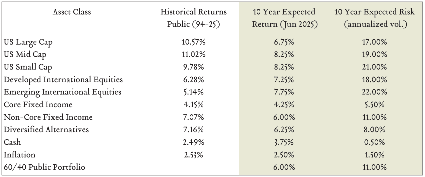 As for the market experience going forward, we share our updated capital market assumptions below. These forecasts represent our expectations for average annualized returns for each asset class over the next ten years. Over the next decade, there will be years when returns exceed our expectations and years when returns trail our expectations. We believe short-term market-timing strategies are unlikely to improve long-term outcomes.