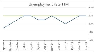 - 4.2% unemployment – unchanged from March. The U.S. unemployment rate was unchanged at 4.2% in April. The unemployment rate has remained in a narrow range of 4.0% to 4.2% since May 2024. The labor force participation was little changed, rising 0.1% to 62.6%. Wage growth was stable at 3.8% year-over-year and +0.2%month-over-month. All data points to a balance between labor supply and labor demand.