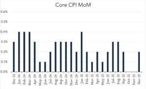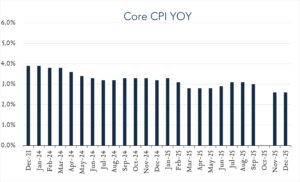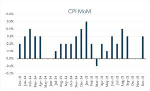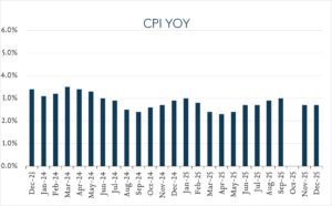 Overall December inflation levels were unchanged from November and aligned with forecasts while underlying inflation levels (core; excludes food and energy) rose less than expected month-over-month – a potential signal of cooling price growth. In December prices rose 2.7% compared to a year ago and 0.3% compared to November. Core inflation rose 2.7% year-over-year and 0.2% month-over-month. Today’s numbers are arguably more reliable than November reporting which was complicated by shut-down related caveats. In December, the FOMC lowered interest rates for a third straight meeting to guard against labor market uncertainty. Fed officials are widely expected to hold interest rates steady at their next meeting later this month, but if inflation remains manageable, we would expect policymakers to favor accommodation in support of the labor market in the year ahead.