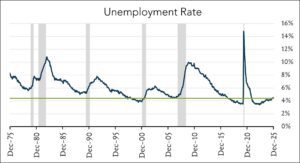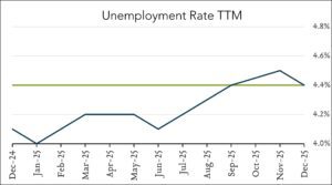 - 4.4% unemployment – down 0.1% month-over-month. The U.S. unemployment rate registered 4.4% in December, down from 4.5% (revised from 4.6%) in November and below expectations for 4.5%. The total number of unemployed people was little changed in the month and the labor force participation rate fell slightly to 62.4% from 62.5% in November.