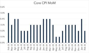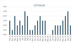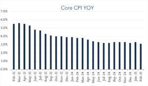 In February, consumer prices as measured by CPI, rose 2.8% compared to a year ago, down from 3.0% in January and below expectations for 2.9%. Core CPI (excludes volatile food and energy prices) rose 3.1%, down from 3.3% in January and 0.1% below forecasts. While today’s report indicates some degree of relief after months of stalling progress on inflation, it does not reflect the price increases that will result from recently announced tariffs. Looking forward and based on the current policy path, inflation is likely to rise amid price increases on a variety of goods from food to clothing to automobiles. These higher costs will test the resilience of consumers and the broader economy. For it’s part, the Federal Reserve remains in wait and see mode until there is more clarity on the Trump administration’s policy agenda and the trajectory of inflation. Policymakers are widely expected to keep rates steady at next week’s meeting but updated rate projections could offer some clues as to the Fed’s expected path in the balance of 2025.