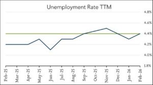 - 4.4% unemployment – up 0.1% month-over-month. The U.S. unemployment rate registered 4.4% in February, up from 4.3%% in January and higher than expectations for the same. At 62.0%, the labor force participation rate fell from 62.5% a month earlier primarily reflecting adjustments to population estimates.