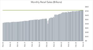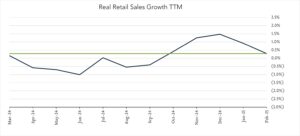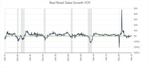 - Real (inflation adjusted) retail sales advanced 0.3% year-over-year. In February, retail sales grew 3.1% nominally netting growth of 0.3% after adjusting for 2.8% inflation. Higher spending at online (+6.5%) and misc. store retailers (+5.0%) was partially offset by slower growth in restaurant dining (+1.5%) and declines at the pump (-0.3%). Seven of thirteen categories advanced in real terms.