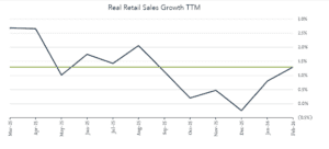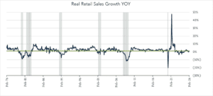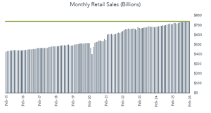 - Real (inflation adjusted) retail sales rose 0.3% month-over-month. In February, nominal retail sales levels increased 0.6% compared to January netting real growth of 0.3% after adjusting for 0.3% inflation. Growth was driven by stronger spending on motor vehicles (+1.2%) and at brick-and-mortar retailers (+1.1%) and gas stations (+0.9%). Ten of thirteen categories advanced in real terms.
