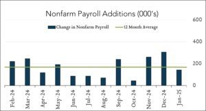 January job gains below expectations, but solid. Nonfarm payrolls increased 143K in January following a (revised) gain of +307K in December and the unemployment rate is 4.0% to start the year. Benchmark revisions for 2024 now show that job growth averaged 166K per month last year, down from 186K per month originally reported. January payroll gains and updated 2024 figures show a moderating yet healthy labor market that continues to support the economy without unduly contributing to inflationary pressures. This balance supports Fed policymakers inclination to hold off on further rate cuts after cutting by a total of 100 bps last year.
