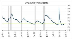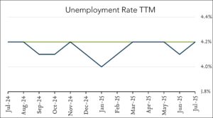 - 4.2% unemployment – up 0.1% month over month. The U.S. unemployment rate rose 0.1% to 4.2% in July matching expectations. The unemployment rate has remained in a narrow range of 4.0% to 4.2% since May 2024. The labor force participation rate declined slightly to 62.2% from 62.3% in June. Wage growth accelerated slightly to 3.9% year-over-year (vs. 3.8% in June and 3.8% forecast) and +0.3% month-over-month (vs. 0.2% in June and 0.3% forecast).
