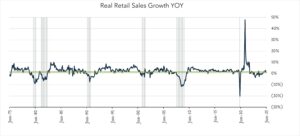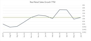 - Real (inflation adjusted) retail sales advanced 0.3% month-over-month. In June, nominal retail sales levels grew 0.6% compared to May, well above forecasts for 0.1% growth and netting real growth of 0.3% after adjusting for 0.3% inflation in the month. Higher spending at brick-and-mortar retailers (+1.8%) and on motor vehicles (+1.2%) was partially offset by a flat month at the pump (+0.0%). Four of thirteen categories advanced in real terms.