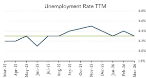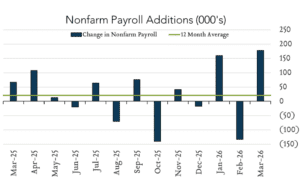 Payrolls and unemployment beat expectations. In March, U.S. payrolls added 178k jobs, beating expectations while unemployment similarly beat expectations coming in just under February’s print. Employers added 178k jobs compared to expectations for 60K in gains and the unemployment rate ticked down to 4.3% from 4.4% a month earlier. Today’s report helps settle some fear about the strength of the labor market although the revised loss of 133k jobs in February remains a concern. The labor force participation rate and number of unemployed people were little changed, showing some stability in the labor market. The stronger jobs report provides the Federal Reserve with some breathing room and will allow them to wait and see how the Iran war effects overall inflation before moving forward with any rate cuts.