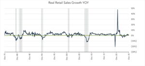 - Real (inflation adjusted) retail sales advanced 0.5% year-over-year. In October, retail sales grew 3.5% nominally netting real growth of 0.5% after adjusting for 3.0% inflation. Higher spending at brick-and-mortar retailers (+9.5%), online retailers (+9.0%) and restaurant dining (+4.1%) was partially offset by slower spending at the pump (+1.9%) and a decline in building materials (-4.5%). Seven of thirteen categories advanced in real terms.
