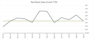 - Real (inflation adjusted) retail sales declined 0.1% month-over-month. In September, nominal retail sales levels grew 0.2% compared to August netting a real decline of 0.1% after adjusting for 0.3% inflation. Higher spending at brick-and-mortar retailers (+2.9%) and gas stations (+2.0%) was partially offset by declines in online retail (-0.7%) and motor vehicles (-0.3%). Five of thirteen categories advanced in real terms.