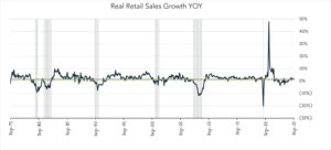 - Real (inflation adjusted) retail sales declined 0.1% month-over-month. In September, nominal retail sales levels grew 0.2% compared to August netting a real decline of 0.1% after adjusting for 0.3% inflation. Higher spending at brick-and-mortar retailers (+2.9%) and gas stations (+2.0%) was partially offset by declines in online retail (-0.7%) and motor vehicles (-0.3%). Five of thirteen categories advanced in real terms.