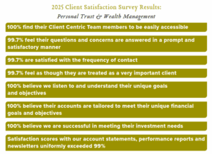 As an example, looking back at recent years’ survey results, it was revealed that the format of our investment performance reporting could be improved to better meet the individual needs of our clients as only 84% of respondents found the report meaningful. Given this feedback, we made it our goal to provide more customized, relevant and meaningful performance reporting. We heard what our clients wanted and responded with updated performance reports tailored to their specific needs. As a result, satisfaction with our quarterly investment performance report format jumped to 97% the following year and sits at 99.4% as of 2025’s survey. Similarly, it was revealed that many clients wanted consolidation of monthly statement packaging several years ago. We listened and responded quickly by consolidating statement packaging starting the following January and the corresponding statement satisfaction score registered at 98%. Similarly, themes from write in comments five years ago centered around our investment platform and online client portal. We took these comments to heart and not only enhanced our investment offering with 100% of responding clients now reporting that we are successful in meeting their investment needs, but we also rolled out our revolutionary online portal called MyWealth by Greenleaf Trust, which allows our clients to view their holistic wealth through a safe and secure personal financial website bringing their entire financial picture together in one place like never before. The last few years of surveys revealed a desire for an increased frequency of economic and financial market updates from our in-house research team. We recognized this as a shortcoming and put a plan in place to improve. This included additional investment seminars and the introduction of a weekly “Market Snapshot” intended to provide a weekly recap of market movements as well as provide an overview of events to pay attention to in the week ahead.