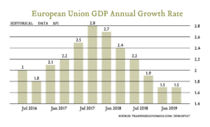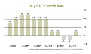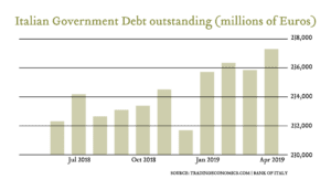 In May 2018 a new government took office in Italy. Giuseppe Conte became Prime Minister backed by two populist, anti-immigration, and Eurosceptic parties. Matteo Salvini, leader of the Northern League, and Luigi Di Maio, leader of the Five Star Movement, became Deputy Prime Ministers of Italy, putting an anti-European spin on budget discussions. Their initial proposed budget was for a deficit of 2.4%, a figure well above the previous government’s 0.8% budget deficit plan. Given the slowing of the European and Italian economies and the already high level of Italian debt, the European Commission protested. (Bond investors also took this badly; see the spike in yields in the chart above at the end of last year.) They pointed out that nothing in the deficit was designed as an investment in the Italian economy (and so could be allowed under EU rules). In fact, the Commission argued that the main new spending plans, Universal Basic Income (UBI) for the unemployed, lowering the pension age to 60 and a flat tax proposal would likely only produce deeper deficits in years to come, especially as the new government also rolled back a scheduled VAT tax rise. The Commission argues that UBI will not be effective without an investment in training and retooling programs. Moreover, one struggles to think of another country which is reducing its pension age rather than extending it because, like Italy, most developed nations have an imbalance between younger taxpayers and a larger population of older citizens.