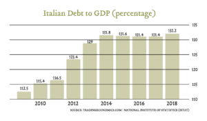The doom loop is the circle of vulnerability where a country’s banking system can be severely hurt by volatility in the price of the sovereign bonds they hold for reserves resulting in a contraction in lending provided by the banks. This contraction in credit, in turn, slows the domestic economy, resulting in a further deterioration in the price of the sovereign’s bond issues as the government is forced to increase its borrowing to maintain services in a period when tax receipts are falling. The loop can also begin with the banking sector if a contraction in bank lending due to liquidity or non-performing loan problems sparks volatility in the government bond prices by slowing the economy and eroding confidence in the sovereign credit. The circle can also be activated by external forces such as a slowdown in global economic activity due to natural recession or trade friction as well as, in the Italian case, a change in the provision of liquidity to the financial system by its external fiscal and monetary partners i.e., the EU or the European Central Bank (ECB). Going the other way in the circle, an Italian bank failure or a blowout in the sovereign spread can adversely affect foreign holders of Italian debt, particularly European banks.