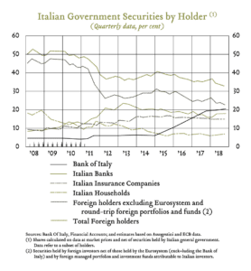Italian government debt is large and growing. The country’s debt to GDP ratio is 132% as opposed to a Euro area average of 86% and is exceeded in Europe only by Greece whose debt to GDP is 182%.1 Since Italy does not control its own money supply, she cannot print money to meet these debts nor can she devalue her currency to boost her economy (her favourite pre-Euro trick). Moreover, the country’s debt is largely owned by two groups. First, of the €2.3 trillion of public Italian debt, the Italian banking system owns 30%, a number that has risen steadily over the past few years.2 Second, foreign investors hold around €575 billion in Italian public and private debt. About 80% of those investors are European investors, mostly asset managers but also banks and domestic households.3 French banks are the most exposed among European banking institutions.