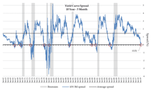 On Friday last week, the U.S. treasury yield curve inverted. Weak economic data out of Europe spurred heavy demand for bonds, pressuring the 10-year yield to 2.44%, its lowest level in over a year and about a basis point lower than the 3-month T-bill yield. This is significant because a curve inversion is considered one of the more reliable indicators of an impending recession. The U.S. is late in its business cycle and near-term recession risks are increasing. Below, we offer some perspective on what an inverted yield curve, and inevitably a recession, can mean for your portfolio.